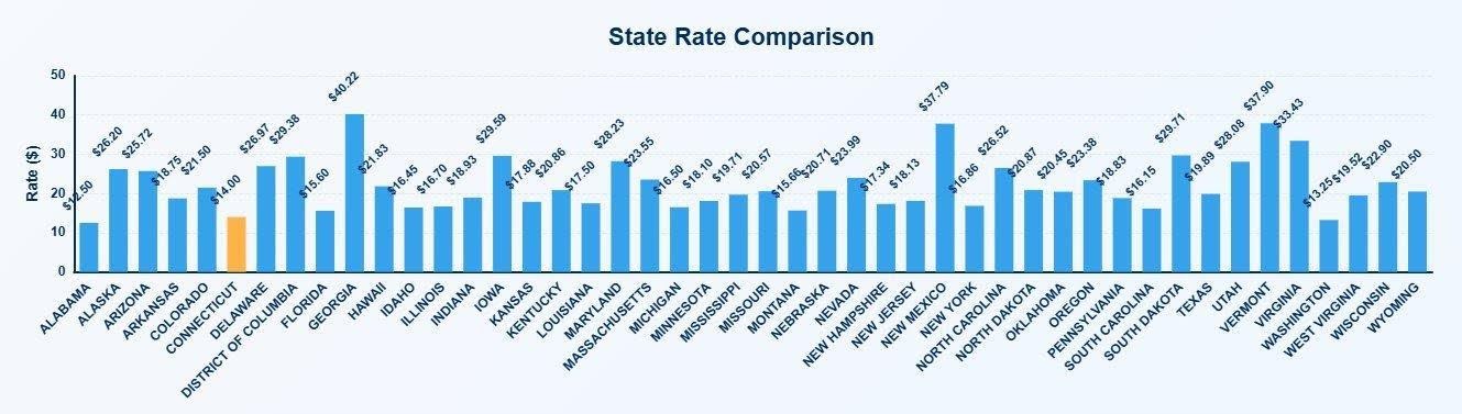 On the unweighted combined average of CPT codes 97153 and 97155, MediRate data places New York at $16.86 per 15-minute unit, well below the national midpoint and among the lowest-paying Medicaid ABA programs in the country. The full national spread runs from around $12.50 at the low end to above $40 in states like Georgia and New Mexico. Neighboring and comparable states pay meaningfully more: New Jersey sits at $18.10, Connecticut at $14.00, and Massachusetts at $23.55.